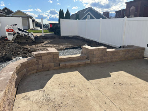 ​Hardscape design and installation project in South Abinton, PA featuring a new Versa Lok retaining wall with steps, 18x15’ Techo Bloc Blu 60 paver patio with walkway (Beige Cream) with brown border. Low Voltage lighting, plantings, mulch and river rock. Installation of hardtop gazebo.